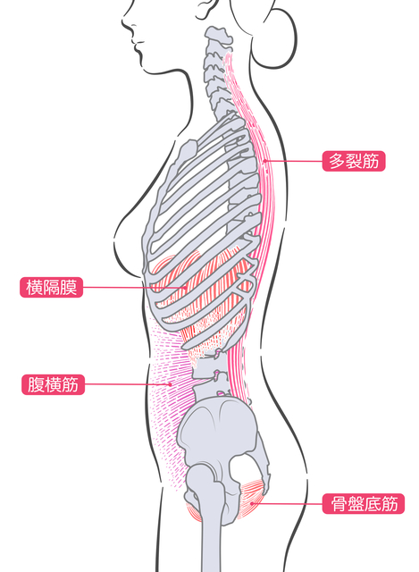 インナーマッスルとは、姿勢の維持、関節の保護、基礎代謝向上、運動パフォーマンスの向上、スムーズな排泄など体全体を支えている大切な筋肉のことで、主に腹横筋、多裂筋、骨盤底筋、横隔膜で構成されています。