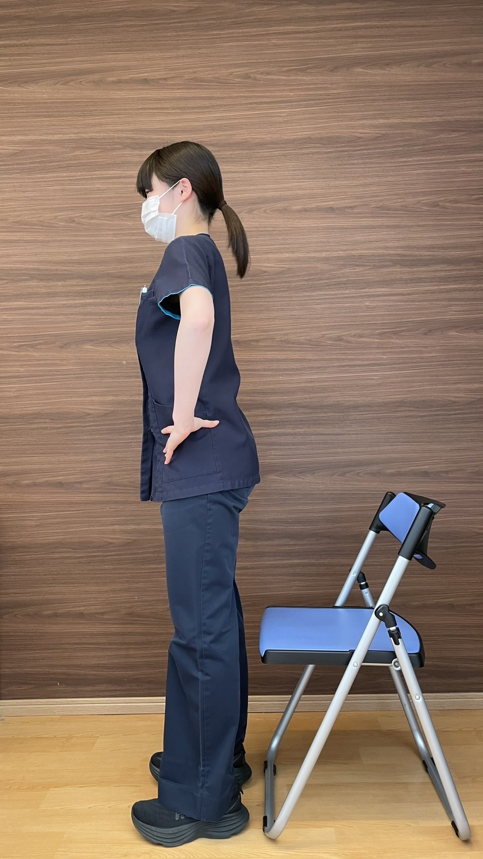 脚を肩幅に開きます。椅子に座るようにおしりを後ろに引きながら膝を曲げて、ゆっくりと元に戻します。スクワットも立位が難しい方は椅子に座って行いましょう。